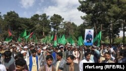 هزاران تن از باشندگان هرات در مقابل ستدیوم ورزشی هرات با دست داشتن عکس های از قوماندانان جهادی و پرچم های سبز رنگ شعار دادند.
