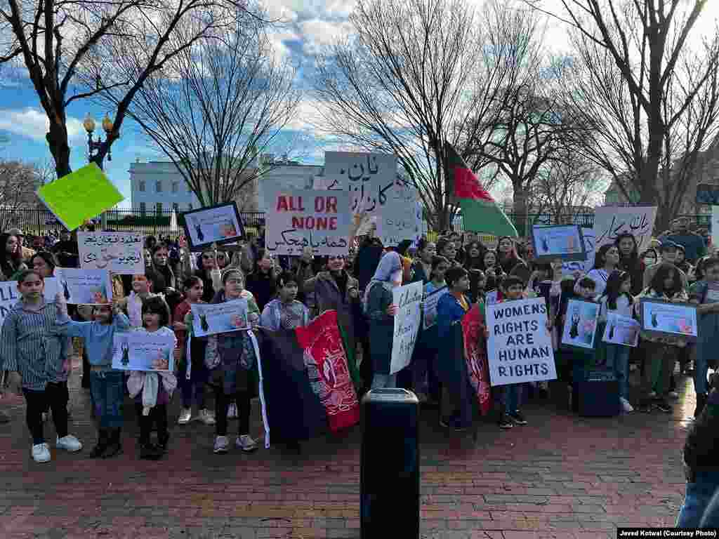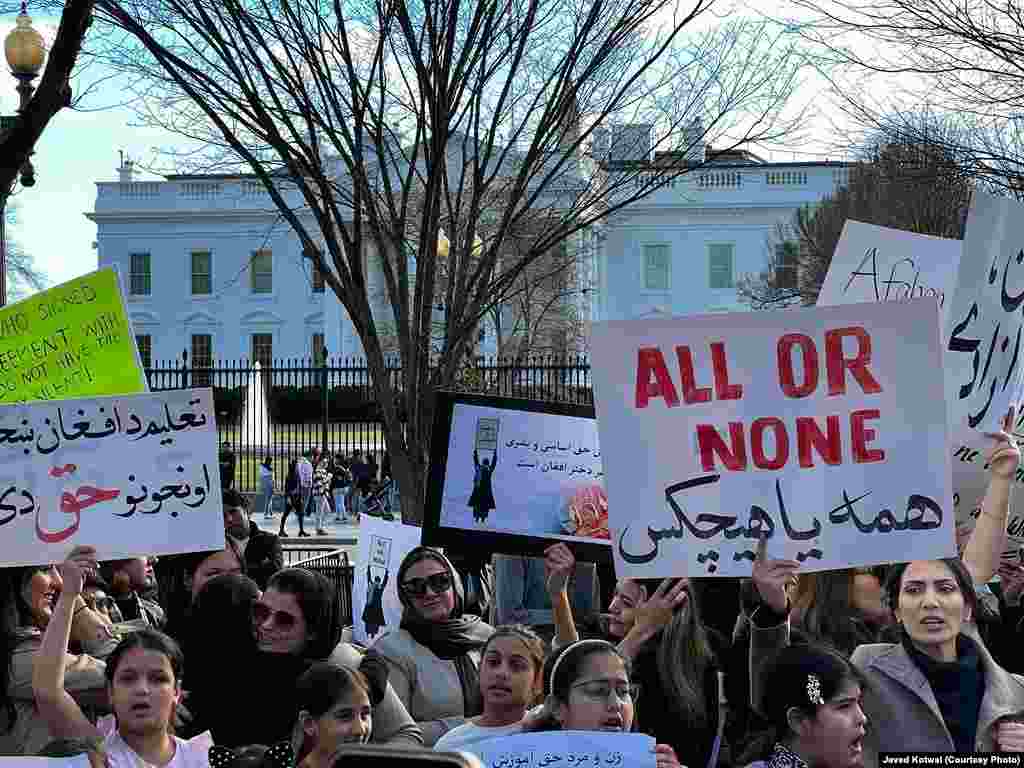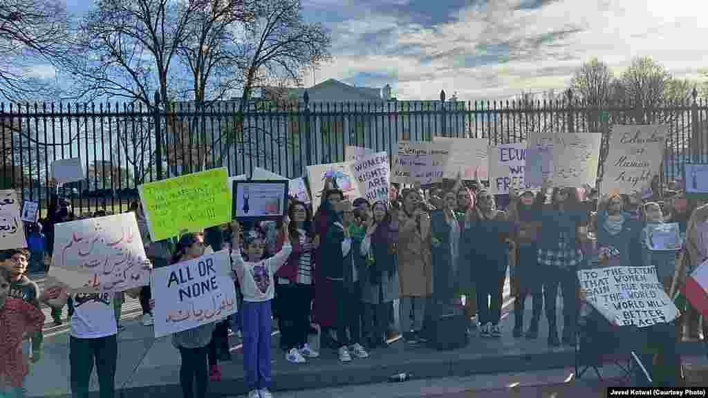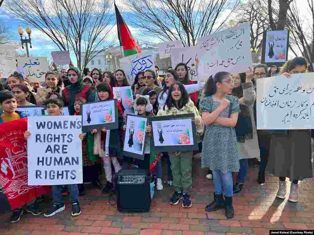 شماری از افغانهایی مقیم ایالات متحده با برگزاری نشست اعتراضی در مقابل قصر سفید در واشنگتن از امریکا و جامعۀ جهانی دیروز خواستند که از زنان در افغانستان حمایت کنند.