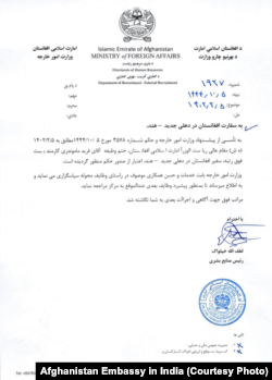 در مکتوب دیگری که در پای آن امضای لطفالله خپلواک، رئیس منابع بشری وزارت خارجۀ حکومت طالبان به نظر میرسد، گفته شده است که فرید ماموندزی سفیر فعلی افغانستان در هند برکنار شده است.